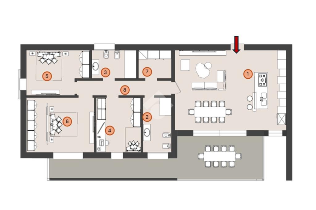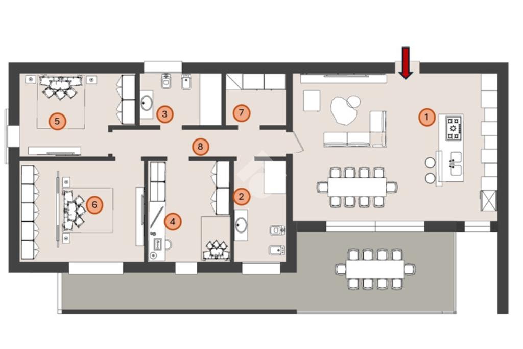 La soluzione proposta è un attico al piano secondo, dotato di ascensore, caratterizzato da un’ampia zona living di 40 mq, tre camere da letto di cui la padronale di oltre 16 mq, due bagni ed un vano tecnico adibito a lavanderia.