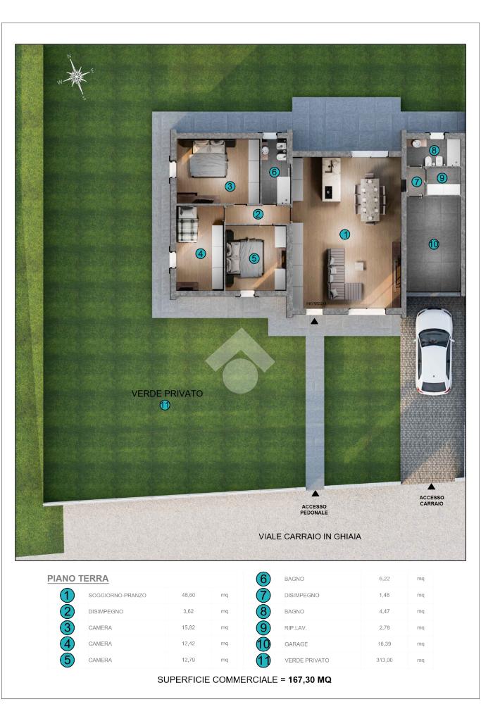 L’abitazione ha una superficie commerciale di 167 mq e dispone di un giardino privato, con accesso indipendente, sia pedonale che carraio tramite una strada interna riservata, che assicura privacy e una limitata esposizione al traffico.
